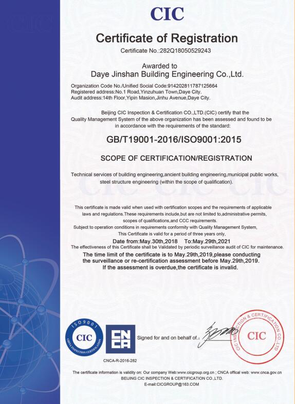 大冶金山建筑工程有限公司始建于1984年,屬鎮(zhèn)辦集體企業(yè)。1997年改制為大冶山建筑工程有限責(zé)任公司,屬股份制企業(yè)。2013年更名為大冶金山建筑工程有限公司,2018年3月公司資源重組,公司注冊資金達到10180.00萬元,公司法定代表人為劉瑞華。公司具有古建筑工程專業(yè)承包壹級、建筑工程施工總承包貳級、市政工程總承包叁級、鋼結(jié)構(gòu)工程專業(yè)承包叁級資質(zhì)。